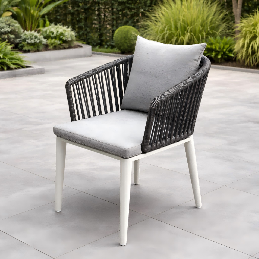 다이닝 체어는 로프로 짜여진 등받이가 특징으로 현대적이고 우아한 외관을 연출하는 동시에 편안한 지지력을 제공합니다. 프레임은 분체 코팅 알루미늄으로 제작되어 녹 및 실외 기상 조건에 대한 저항력이 뛰어납니다.